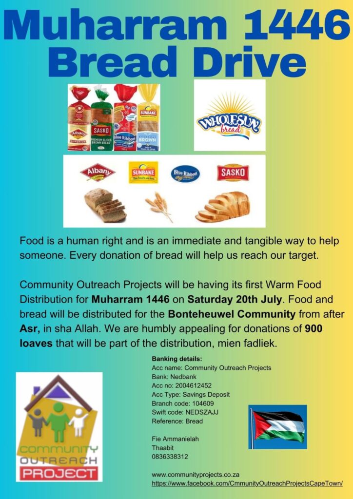 On Saturday 20 July, Community Outreach Projects will do its first warm food distribution for the Hijri year 1446 for the Community of Bonteheuwel. We are once again appealing to the community to assist us in reaching our target of 900 loaves of bread to be distributed during the warm food project.