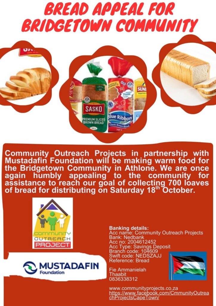 Community Outreach Projects in partnership with Mustadafin Foundation have earmarked Bridgetown Community for our next warm food distribution. We are once again humbly appealing to the community to assist us to reach our goal of collecting 700 loaves of bread for distributing on Saturday 18th October, in sha Allah.