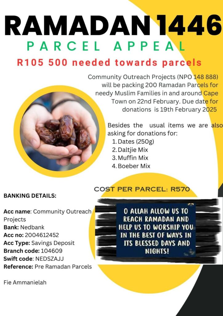 Community Outreach Projects has once again embarked on the initiative to collect food items for 200 needy families so they can also have something for Sehri and Iftar. We are hereby humbly appealing to the community to assist us in reaching our goal. Our niyah is pack the parcels on Saturday 22 February, in sha Allah. Besides the normal food items, we are also appealing for donations of dates, daltjie mix, boeber mix and muffin mix.
